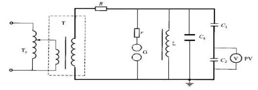 L—補(bǔ)償電抗器:CX—被試品電容: C1、C2—電容分壓器高、低壓臂:PV—電壓表